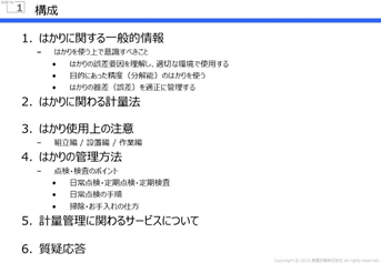 勉強会の内容は「はかりの自主点検のポイント」「はかりの基本的な構造」「はかり使用上の注意点」「機器の手入れ方法」「計量法について」等、お客様のご要望に合わせて実施いたします。実際に現場でハカリをご使用いただく方々に、実機を用いた取り扱い方の説明も可能です。