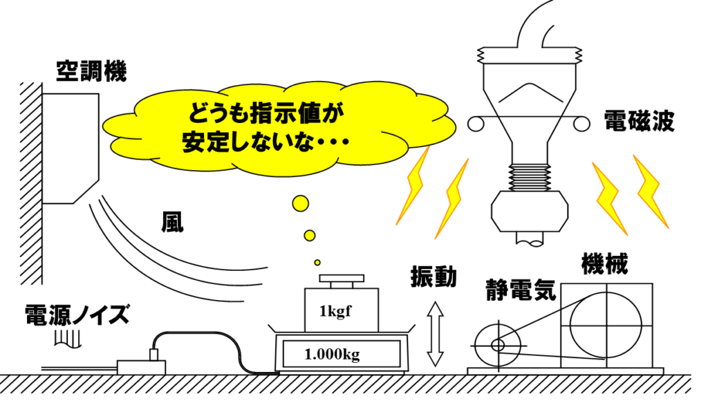 はかりには、計測原理や構造・材料等の内部要因、使用環境等の外部要因が相互に影響しあい、様々な誤差要因が存在します。