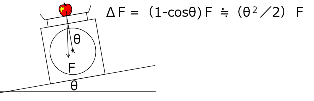 結果、はかりに対し垂直な成分の力のみを検出することになるため、本来の質量値よりも表示値が軽くなってしまいます。これを傾斜誤差と呼びます。