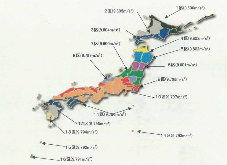 日本では重力加速度値分布を16区に分けており、使用する地区に応じて製造者が調整を行っています。