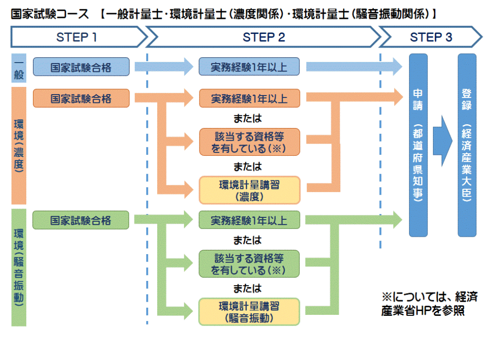 計量士の資格は、環境計量士(濃度関係)、環境計量士(騒音・振動関係)及び一般計量士 の3区分に分かれています。