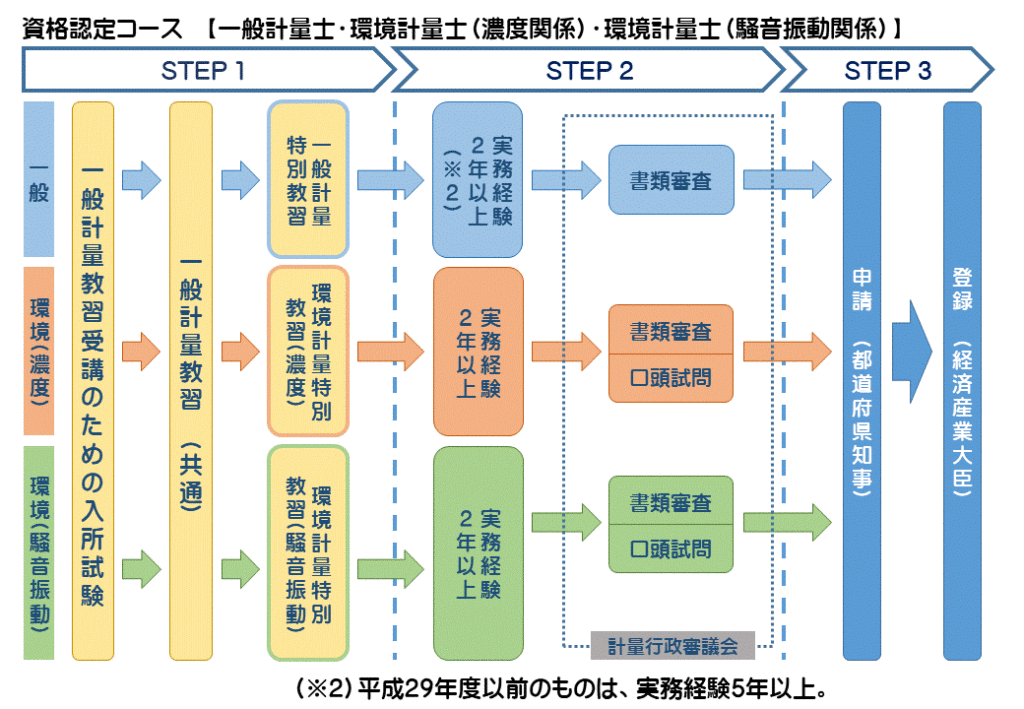 それぞれの資格を取得する方法は2つあり、国家試験コース(計量士国家試験に合格し、かつ実務経験その他の条件を満たし登録)と資格認定コース(国立研究開発法人産業技術総合研究所の教習の課程を修了し、実務経験などの所定の条件を満たして計量行政審議会が認め、登録)があります。