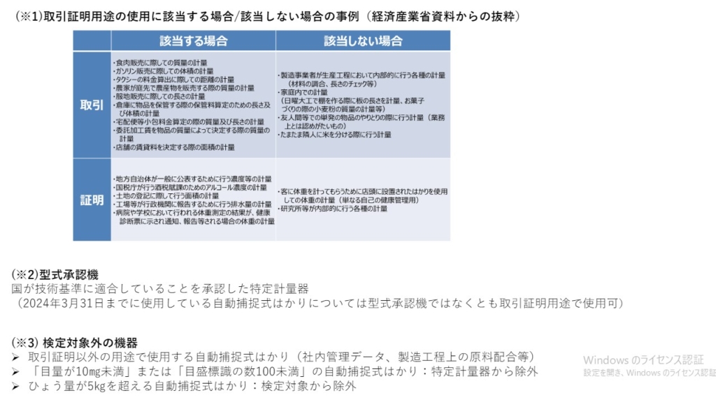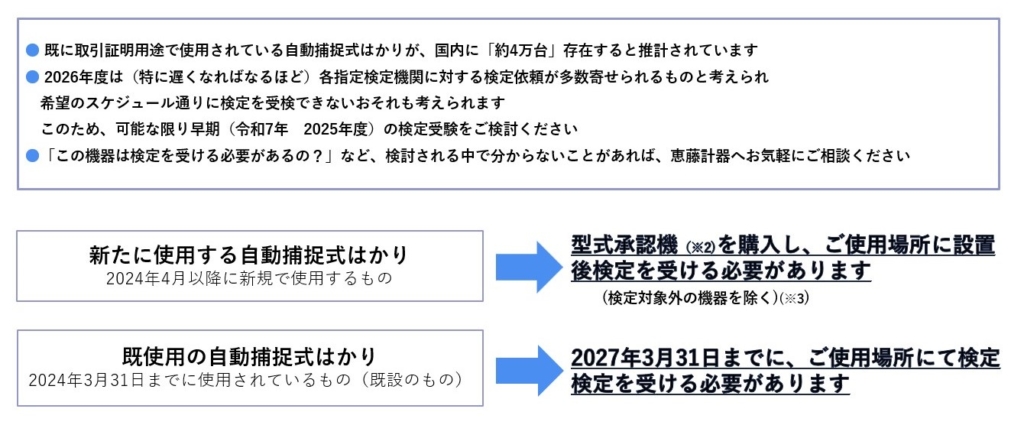 既使用の自動捕捉式はかり(ウェイトチェッカ等)については、2027年3月31日までに検定を受ける必要があります(取引証明用途)