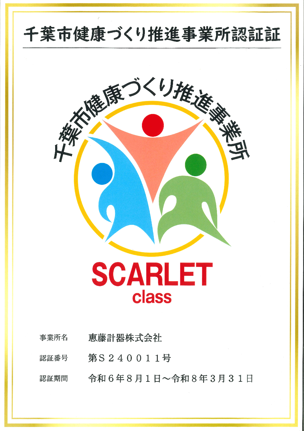 この度、恵藤計器は千葉市が推進する「千葉市健康づくり推進事業所」の最上位クラスである「スカーレットクラス」として認証されました。