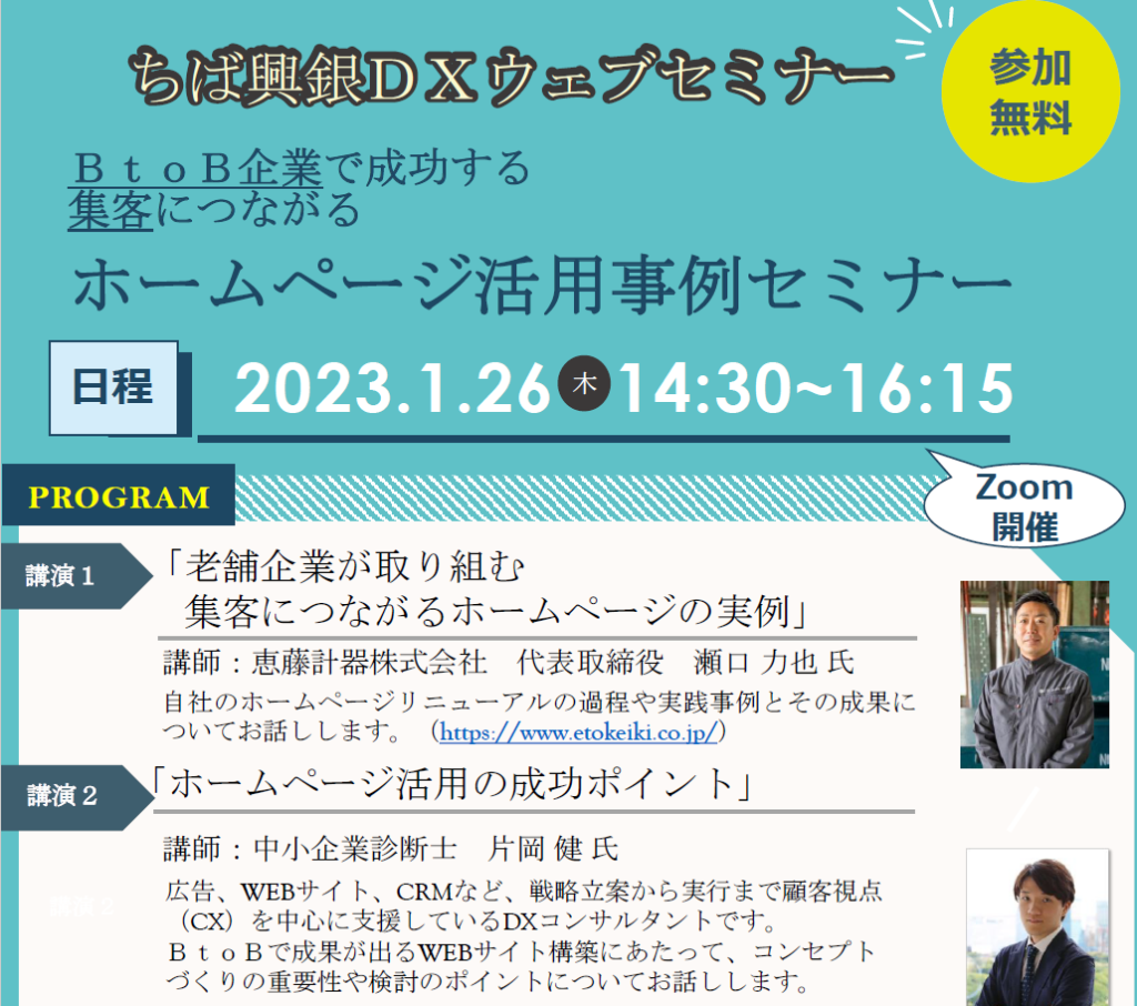株式会社千葉興業銀行様主催の【ちば興銀DXウェブセミナー】に当社代表取締役の瀬口が講師として登壇いたします。「 老舗企業が取り組む 集客につながるホームページの実例 」と題し、瀬口からは主にホームページのリニューアルに伴う検討過程や実践、そ... -